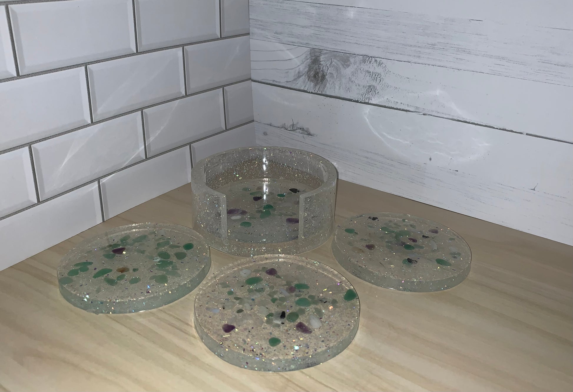 These acrylic coasters are infused with gemstones and come with a coaster holder.